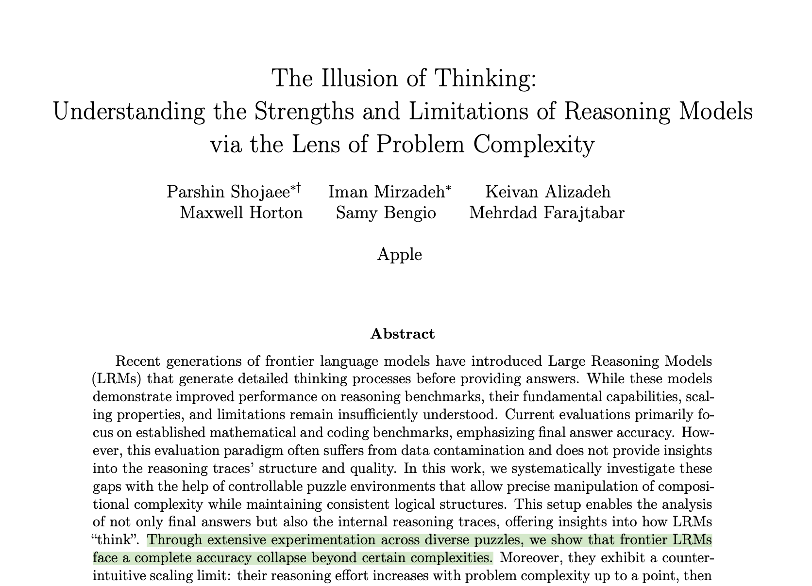 “Through extensive experimentation across diverse puzzles, we show that frontier LRMs face a complete accuracy collapse beyond certain complexities. Their reasoning effort increases with problem complexity up to a point, then declines.”